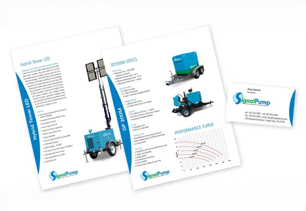 SignalPower and SignalPumps produce industrial power equipment, hybrid LED light towers, and engineered pump systems. They needed clear, professional collateral to present highly technical products to distributors, buyers, and end-users.